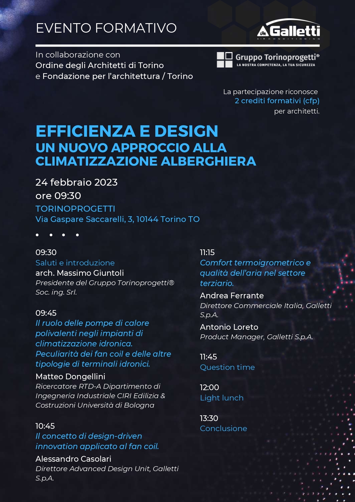 Il seminario, a cui potranno partecipare gratuitamente 50 architetti, affronterà una serie di tematiche legate ai fabbisogni termici delle strutture ricettive e si svolgerà in presenza il prossimo 24 febbraio 2023 presso Torinoprogetti in Via Gaspare Saccarelli, 3 a Torino a partire dalle 9:30 sino alle 13:30