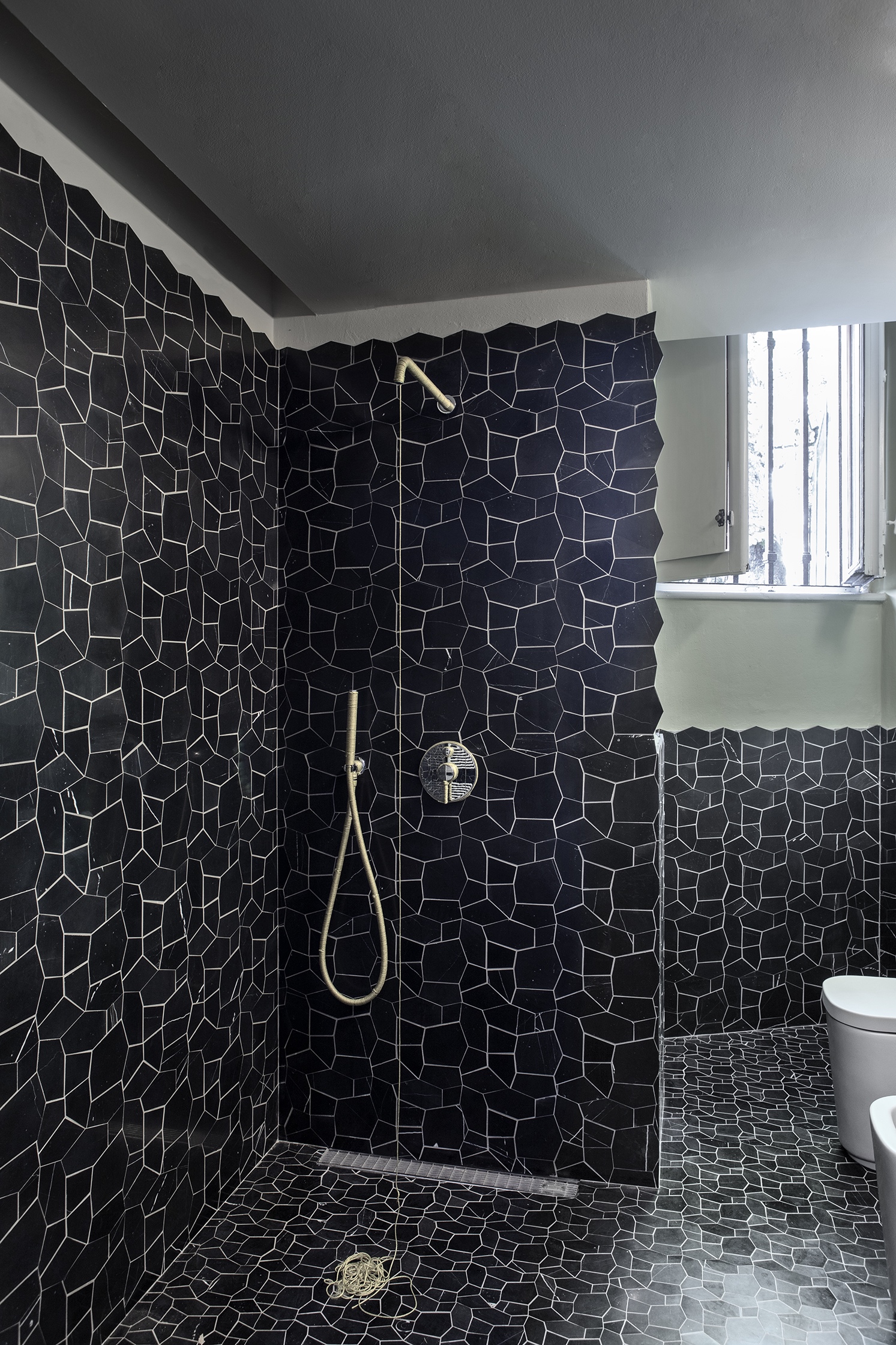 La trama creata dalle tessere del mosaico si interseca con quella della fuga in una rete senza soluzione di continuità. In POLIGONI la modularità della texture trasforma il concetto tradizionale e antico dell’arte palladiana, definito dall’irregolarità della forma. I tozzetti, uno differente dall’altro, si muovono e si accostano occupando in modo tutt’altro che casuale il proprio posto nella matrice.
