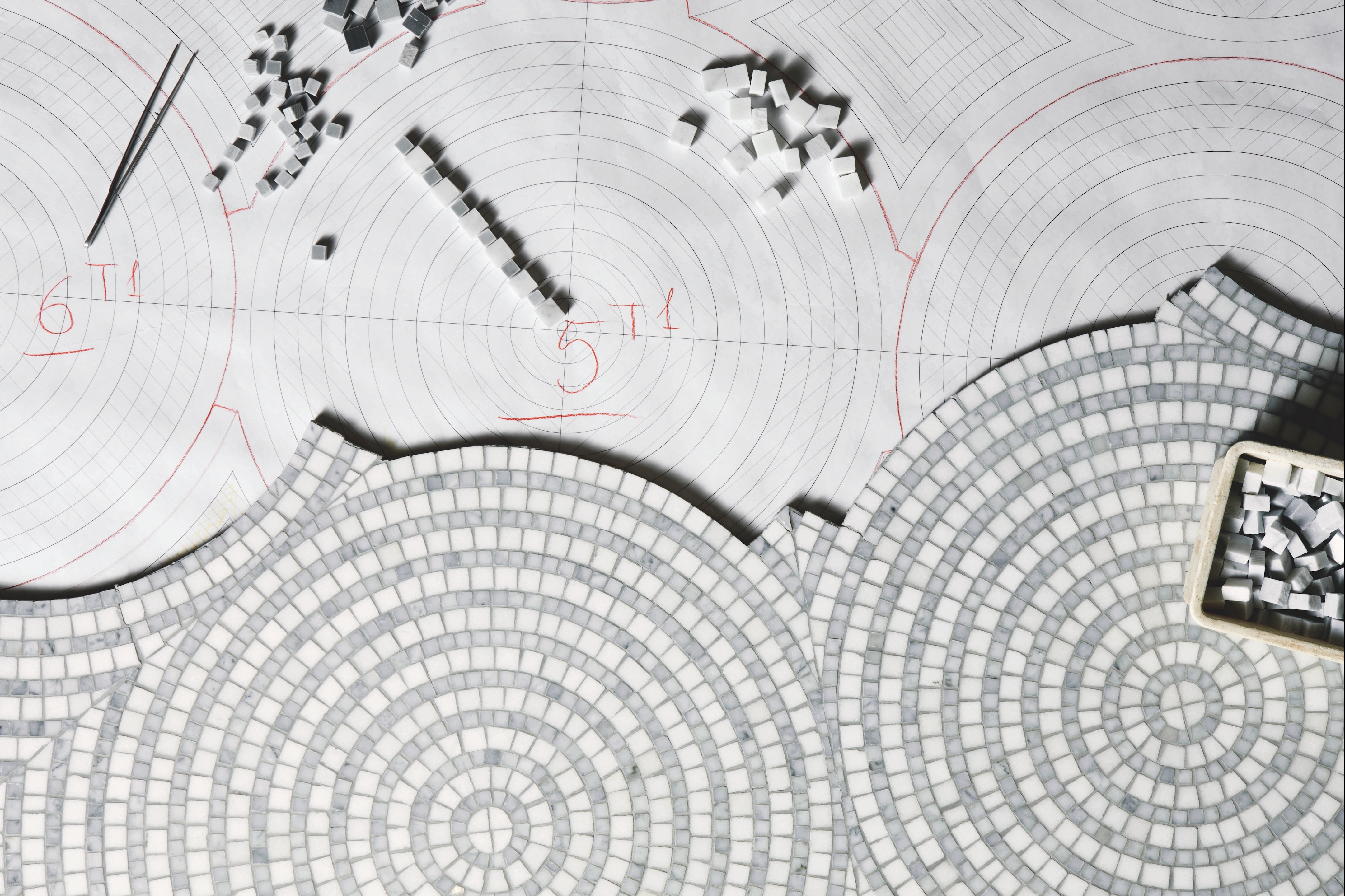 Per il catalogo Contemporaneo, ad esempio, Friul Mosaic ha scelto di presentare oggi Curve, caratterizzata da un’affascinante forma geometrica, quella del cerchio, che permette di unire le proprie linee per ricoprire porzioni di piano senza lasciare spazi vuoti formando cioè sempre triangoli intorno a ogni vertice.