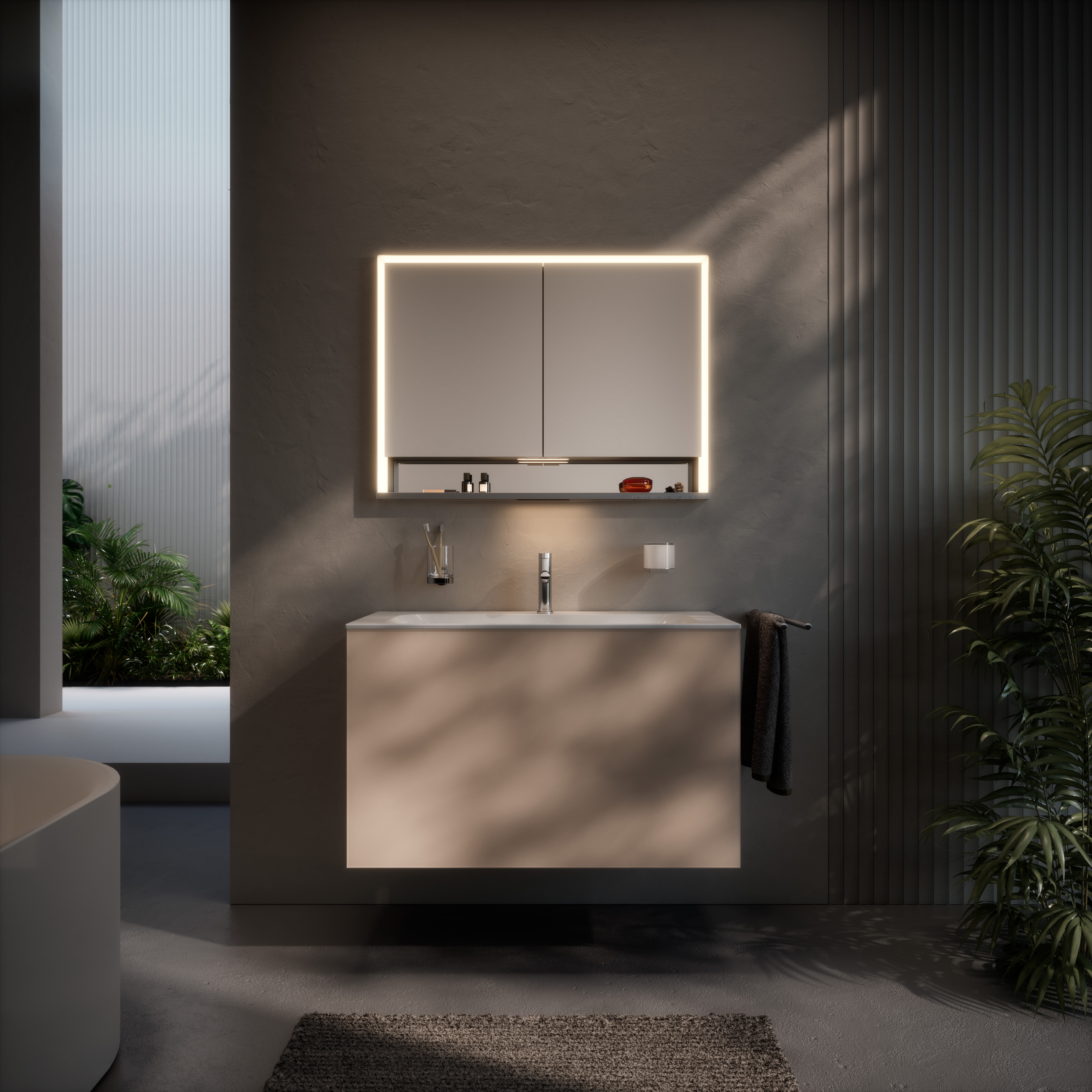 Lo specchio ROYAL LUMOS è disponibile nella nuova profondità di 130 mm, invece dei normali 165 mm, in un look ristretto e sempre elegante. Essendo un modello a parete, lo specchio contenitore nella versione ridotta è più discreto e sta bene ovunque. Nonostante la profondità contenuta, la superficie è perfetta per accogliere anche prodotti per la cura di grandi dimensioni negli scomparti di alluminio dalla qualità unica. Questa versione di ROYAL LUMOS è ideale per bagni più piccoli, per il bagno degli ospiti o per quello di servizio. L'eccezionale versione da incasso nasconde il suo spessore nella parete. Grazie alle nuove dimensioni, può essere utilizzato anche in pareti sottili. Inoltre, anche il peso avvantaggia gli esperti in fase di installazione.