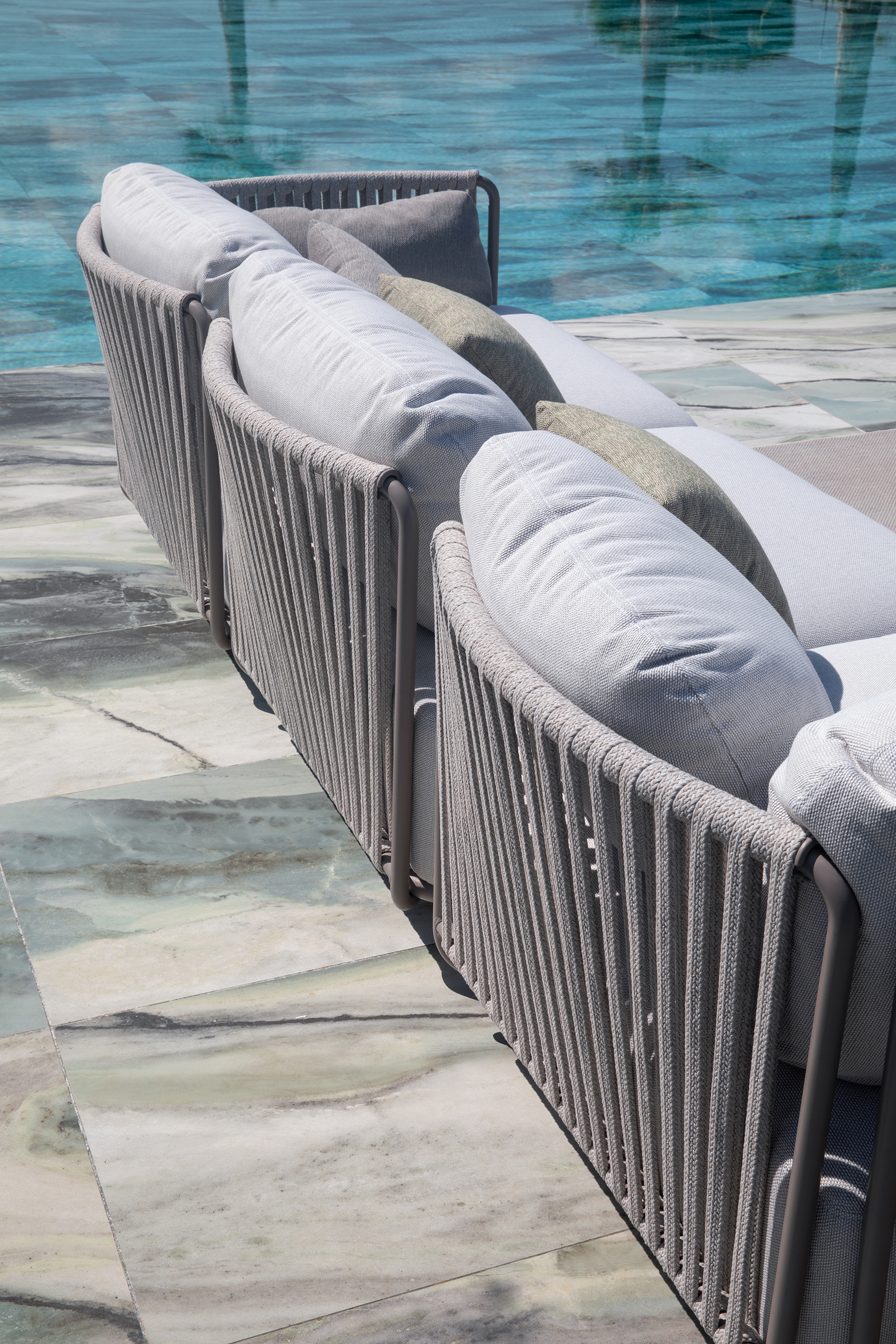Prodotta in acciaio zincato, tessuto e corda, NÉA è un sistema modulare progettato per offrire infinite configurazioni personalizzabili, arricchite da cuscini generosi e confortevoli realizzati con tessuti di alta qualità, resistenti ai raggi UV e impermeabili, abbinati a imbottiture in poliuretano espanso che assicurano comfort, stabilità della forma e durata nel tempo.