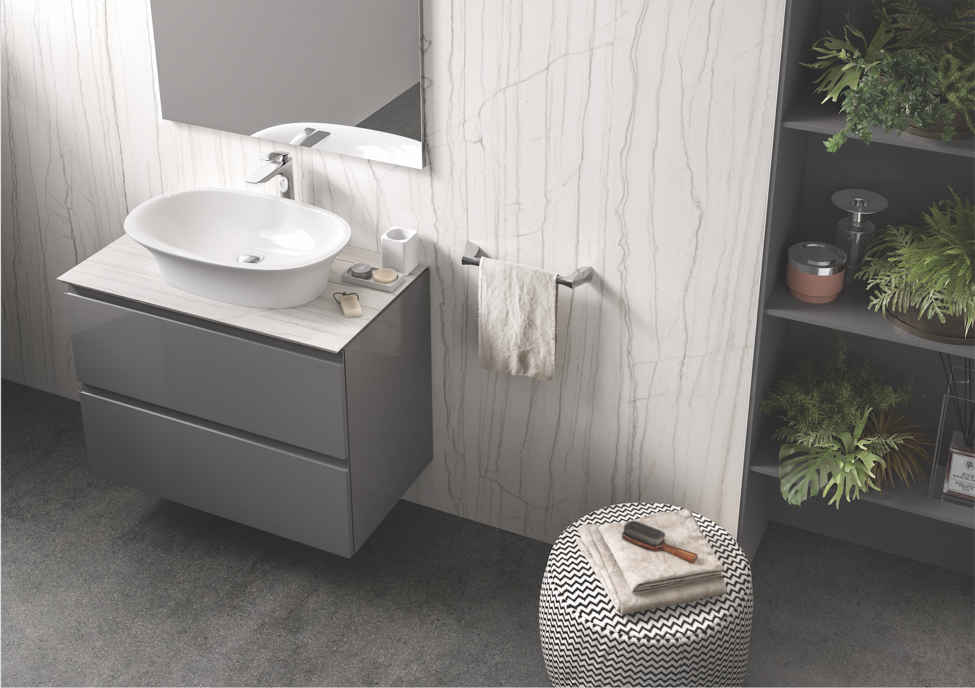 RAK-Precious, una speciale gamma di soluzioni di lusso per l\'area lavabo. Con finiture più ricche, RAK-Precious offre un\'elegante alternativa alla classica ceramica bianca per creare un ambiente total look dove lavabi integrati, pavimento, rivestimento, mobili e accessori dialogano in grande armonia.