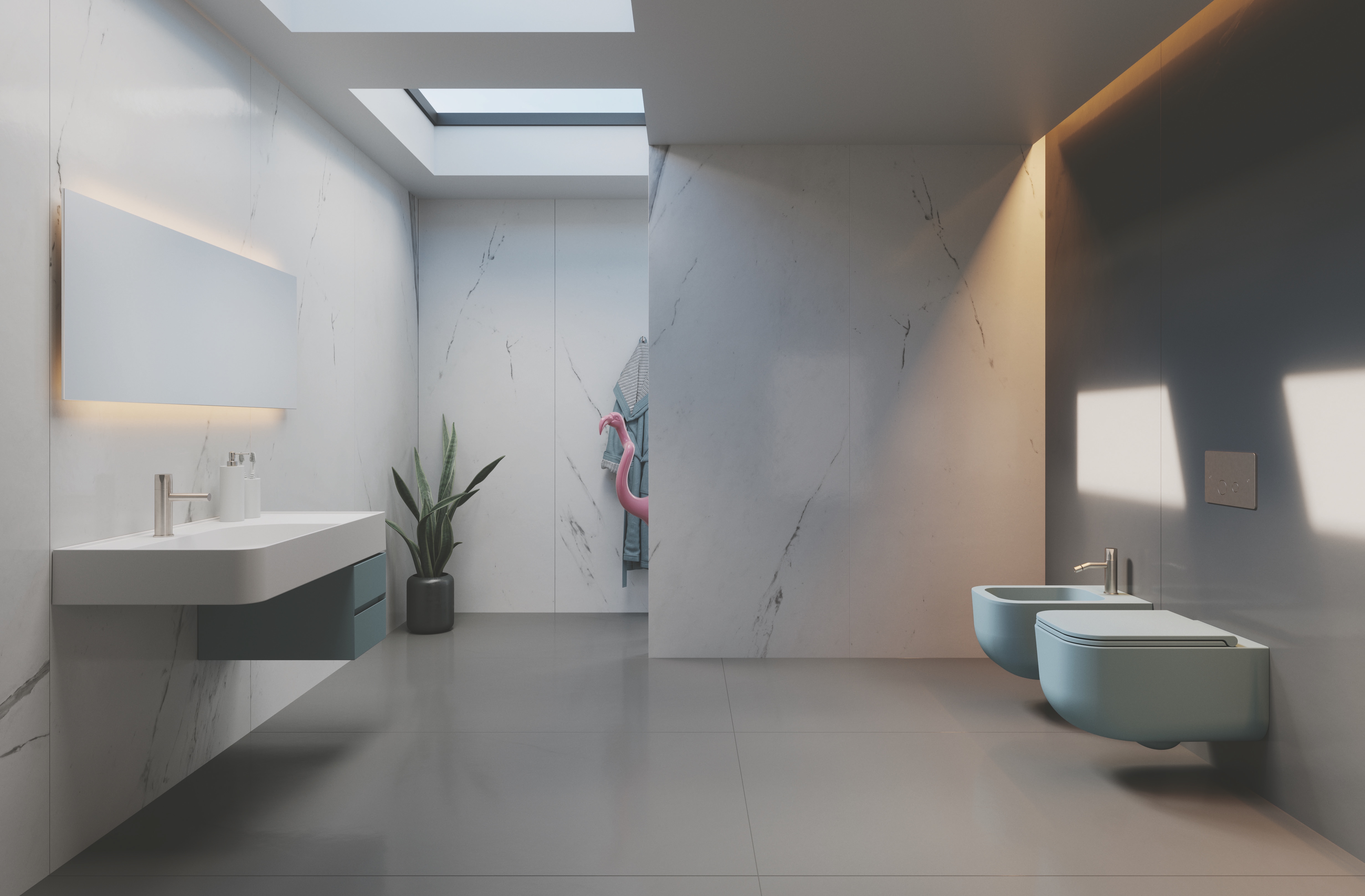 BIANCO COME LA SABBIA, AZZURRO COME IL MARE. L’estate si tinge di Revolution® il bagno ribelle di SDR CERAMICHE. Nuance: Avio e Cotone.