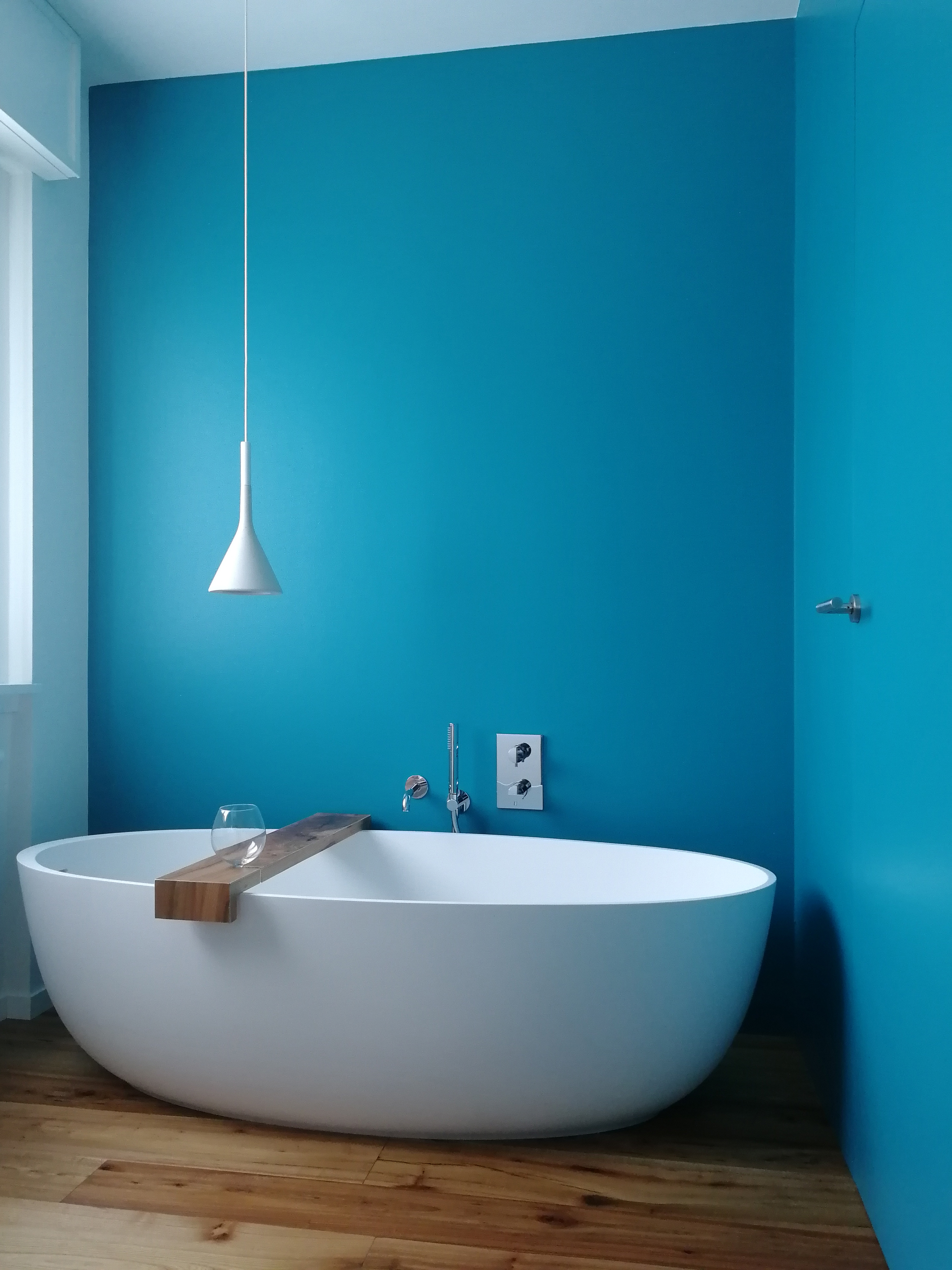 Nell’abitazione di Riva del Garda, è stato dedicato un ampio spazio all’ambiente bagno. Sono state infatti realizzate due zone: la prima che accoglie il piatto doccia e la vasca, volta alla cura di sé e al proprio relax. Una lampada di design in cemento scende dolcemente sopra la vasca e ti accompagna in un percorso di benessere tra un bicchiere di vino e la lettura di un libro in totale intimità. La seconda zona, più funzionale e separata, completa il tutto con i sanitari.