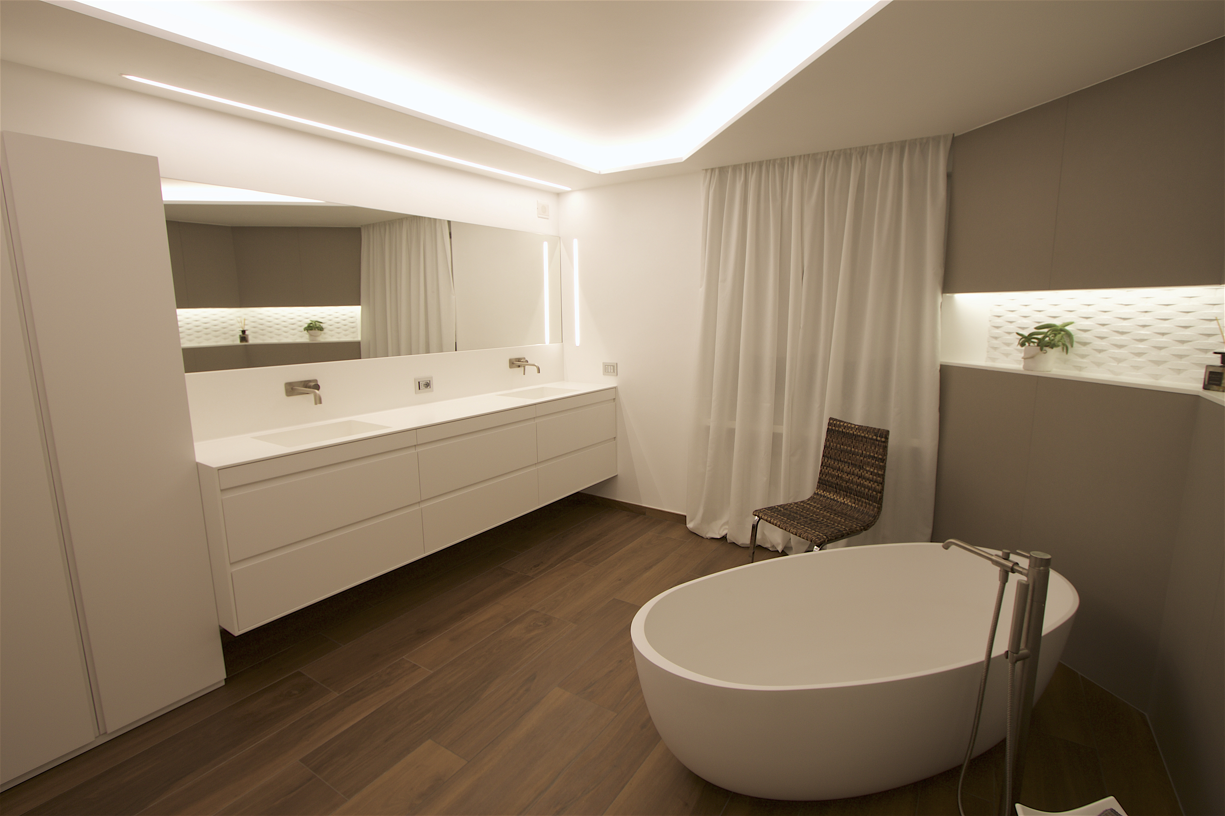 VERSATILE E SARTORIALE LA MANO DI PLANIT VESTE L’AMBIENTE BAGNO SU MISURA Non ci sono limiti alla progettazione. Questo il mantra che spinge PLANIT a sfidarsi costantemente cercando sempre soluzioni diverse attraverso la sua specializzazione ventennale nella lavorazione del Corian®. L’ultimo successo raggiunto dal team dell’azienda altoatesina li ha visti impegnati nella realizzazione di un mobile lavabo completamente personalizzato. L’abitazione privata che ospita questi eleganti elementi forniti da PLANIT è stata curata da Francesca Oss, sia per quanto riguarda la parte di interior design che di progettazione. Si tratta di uno spazio essenziale e futuristico con sfumature calde e materiche date dai pavimenti e dai complementi d’arredo. La fase della progettazione che più ha stimolato la creatività di PLANIT e l’utilizzo di un materiale plasmabile come il Corian®, riguarda la zona lavabo. Partendo da un mobile basico, l’idea è stata di rivestire il tutto con lastre di Corian®, a partire dall’esterno della struttura per arrivare ad una alzata di dimensioni ampie che collega il mobile allo specchio e accoglie i rubinetti a muro. Per completare l’opera sono stati utilizzati ed integrati nel mobile due lavabi modello Libra in Corian® Glacier. Questo lavabo rispecchia la purezza del bianco, la precisione degli angoli arrotondati, la perfezione di un bacino unico e dalle linee senza interruzioni, grazie alla piletta rivestita. Attraverso il calore del Corian® che rispetto alla ceramica incarna forme armoniose ed esteticamente piacevoli, il lavabo di Planit dona al bagno una sensazione avvolgente, confortevole. Dalla estrema attenzione ai dettagli che contraddistingue PLANIT inoltre nasce il desiderio di curare alcuni particolari come la copertura del davanzale della finestra e il rivestimento del piano della nicchia, le cui pareti sono invece in gesso.