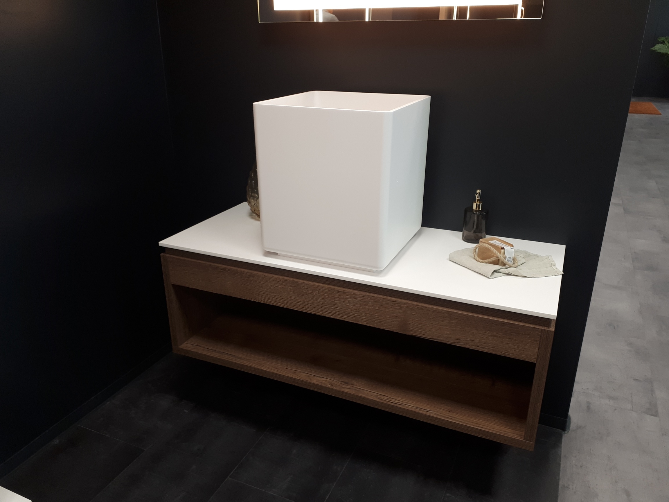 Il lavabo TRIADE EVOLUTION è ispirato ad un arredamento in stile minimal ed è disponibile a catalogo nelle versioni da appoggio, sospeso a parete -in due diverse altezze-, o freestanding. La copertura dello scarico in Corian® è un ulteriore segno distintivo.